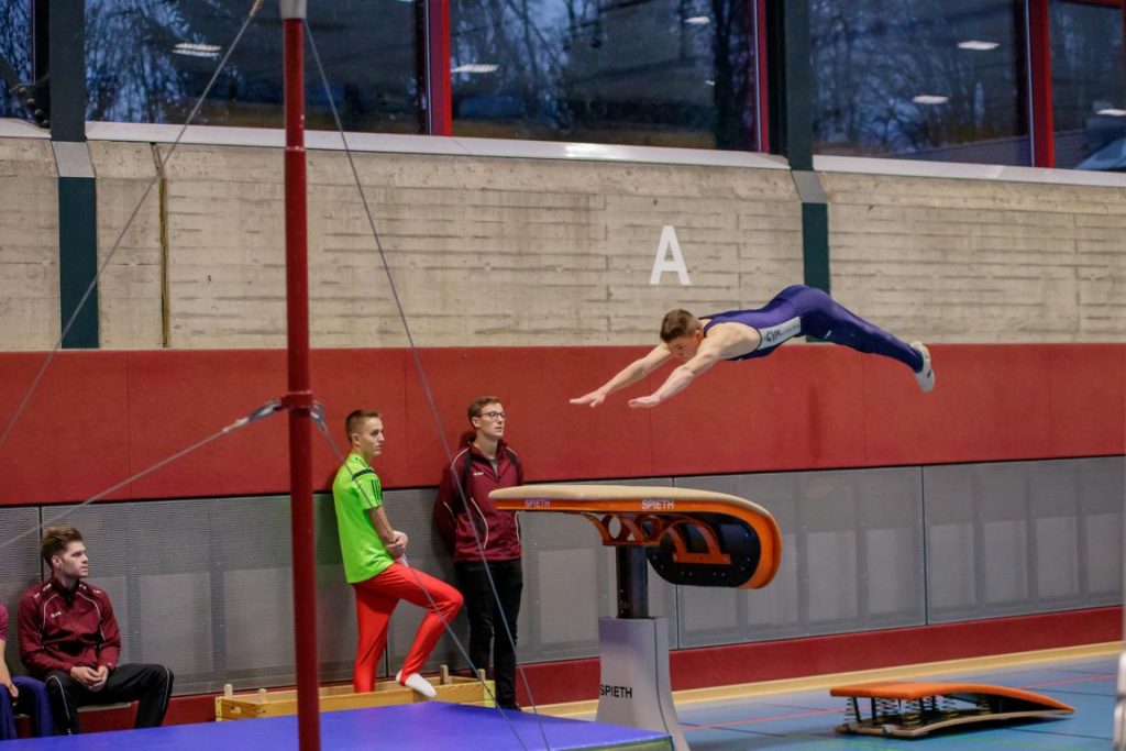 An den sechs olympischen Geräten turnten die Aktiven und Junioren der TG. Durch die Relegationswettkämpfe der dritten Bundesliga am Vortag gab es eine zusätzliche Bescherung. Die erste Mannschaft der Wettkampfgemeinschaft Biberach-Bad Waldsee rückt für die kommende Saison 2019 von der Bezirksliga Süd in die Landesliga nach, da ein schwäbischer Vertreter von der Oberliga in die Bundesliga aufsteigt. Die Turner der Landes- bzw. Kreisligamannschaft zeigten konstante Leistungen. Bei den Aktiven überzeugte Marc Pfeilsticker (Foto, Sprung) vor Yannick Naef.