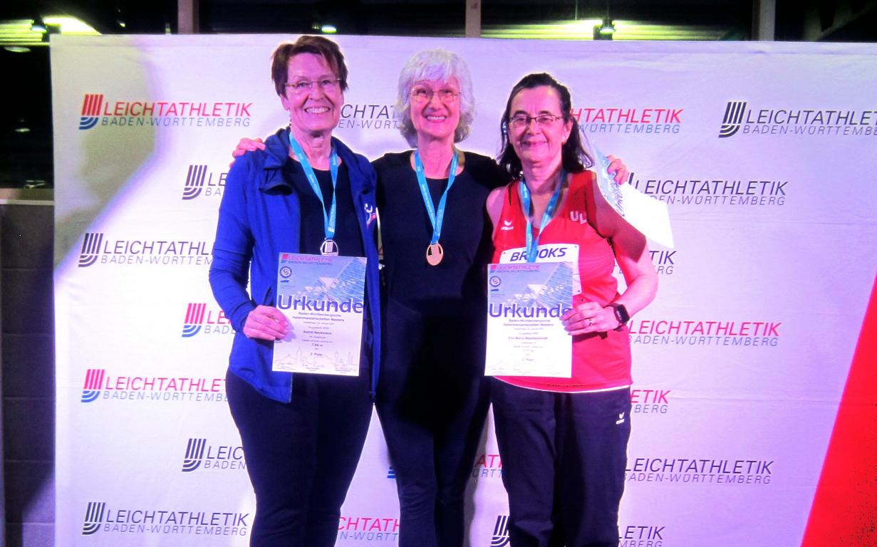 Bei den Baden-Württembergischen Hallenmeisterschaften der Master (Senioren) in der Leichtathletik-Hochburg Sindelfingen konnte Cena Schili (AK W65, Bildmitte) von der TG Bad Waldsee erneut Medaillen sammeln. Trotz eingeschränkter Trainingsmöglichkeiten in der Wintersaison konnte Sie sich vor der Konkurrenz behaupten. Im Hochsprung gewann sie mit soliden 1,20 m. Auch im Kugelstoßen (3 kg) konnte sie sich mit 7,92 m durchsetzen und sich somit zwei Meistertitel sichern.